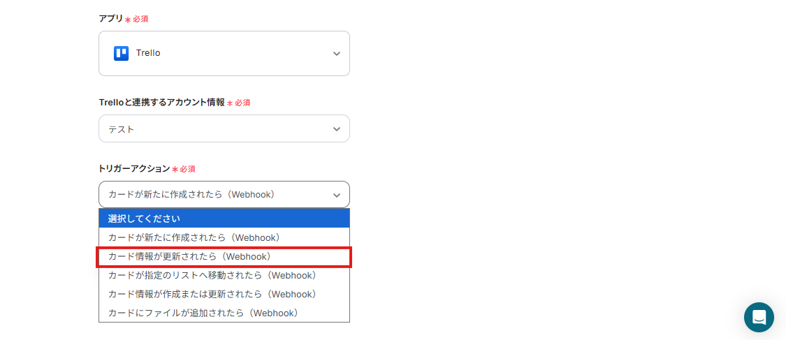 「カードが新たに作成されたら(Webhook)」という項目をクリックしてください。