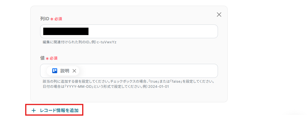 - Codaのテーブルに追加する情報は、Trelloのカード名や説明、期限など、取得した情報の中から任意で選択し、設定してください