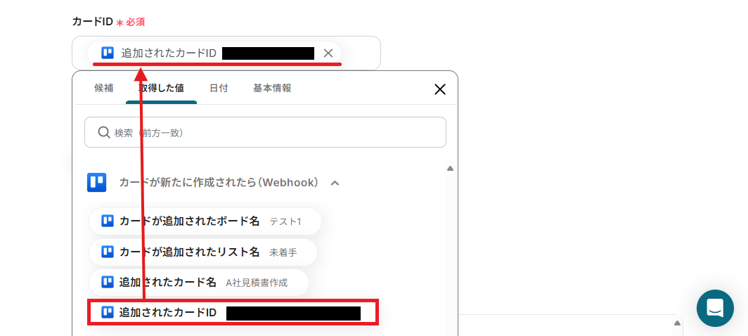 - 続いて、オペレーションでTrelloの「カードの情報を取得」アクションを設定し、作成されたカードの詳細情報を取得します。
