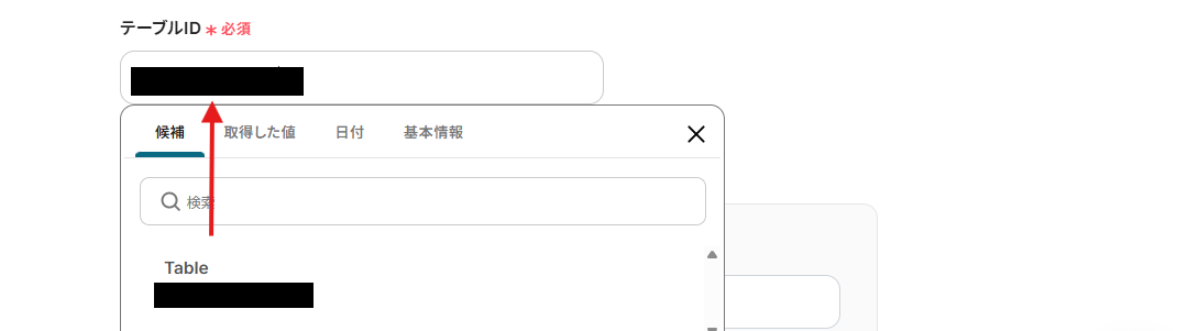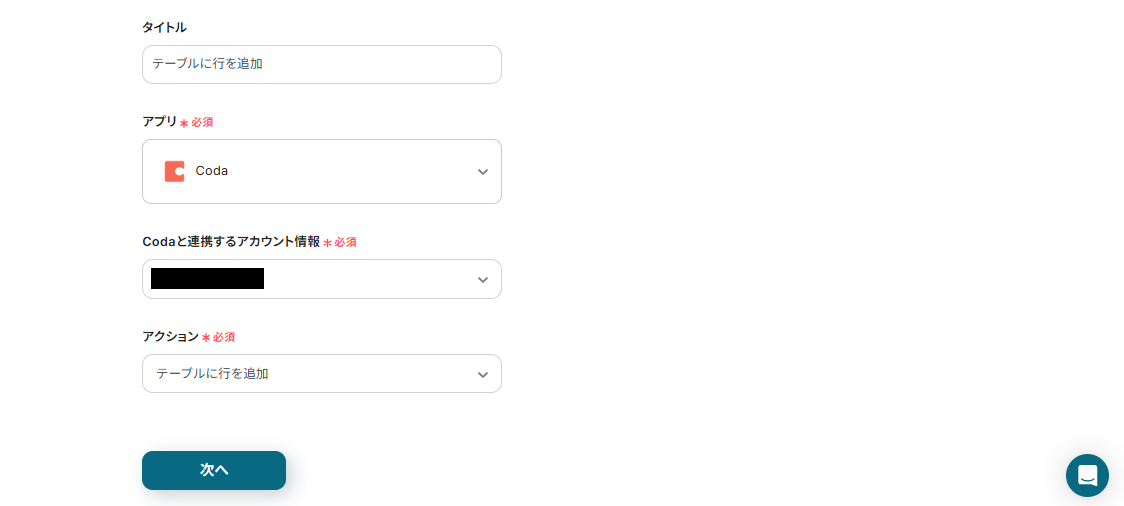 - Codaの「テーブルに行を追加」アクションを設定する際に、対象のテーブルや行に追加する情報を任意で設定してください。