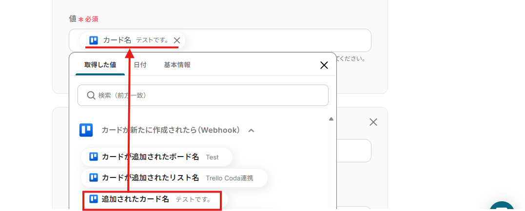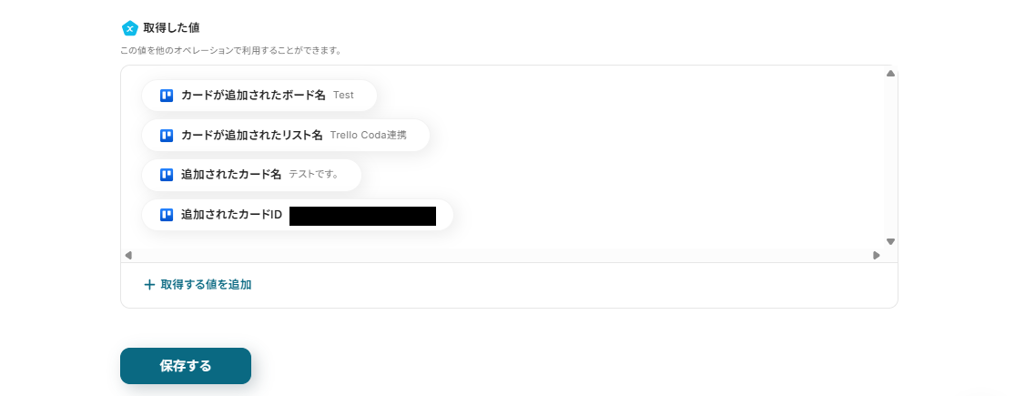 - Trelloから取得したカード情報(カード名、説明文、ラベルなど)の中から、Codaのテーブルに追加したい項目を選択し、マッピングします。