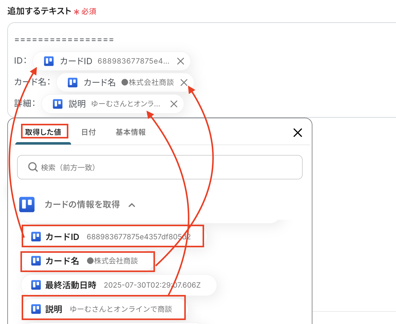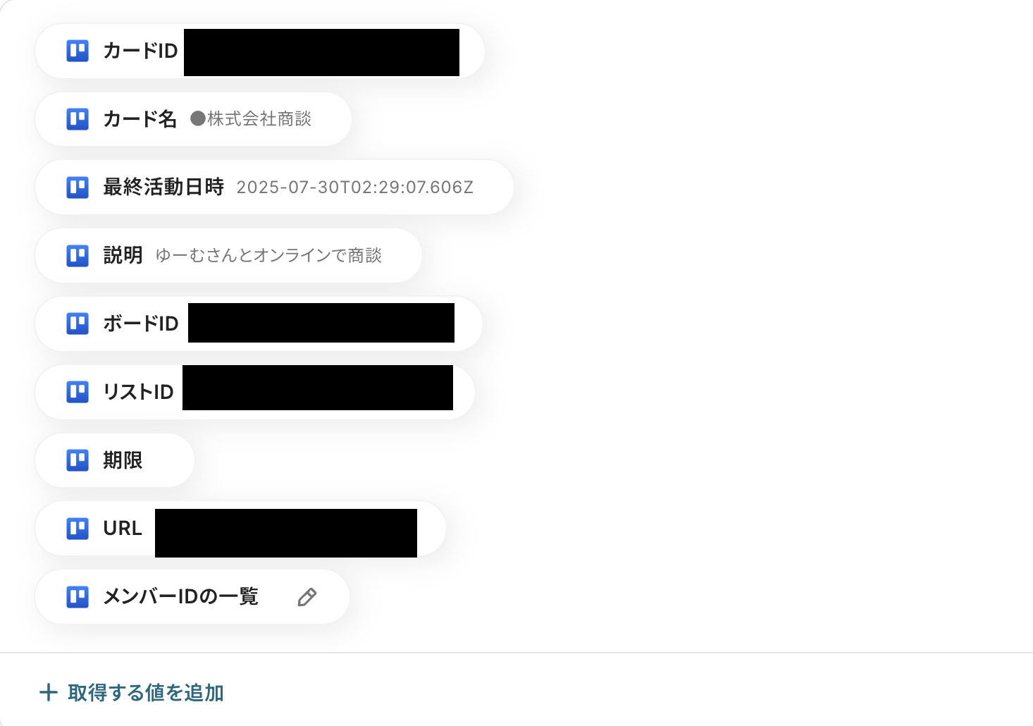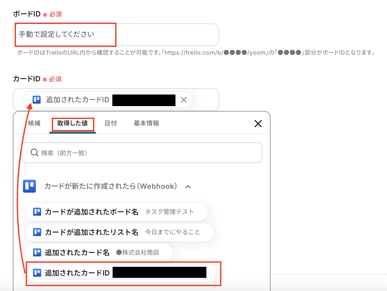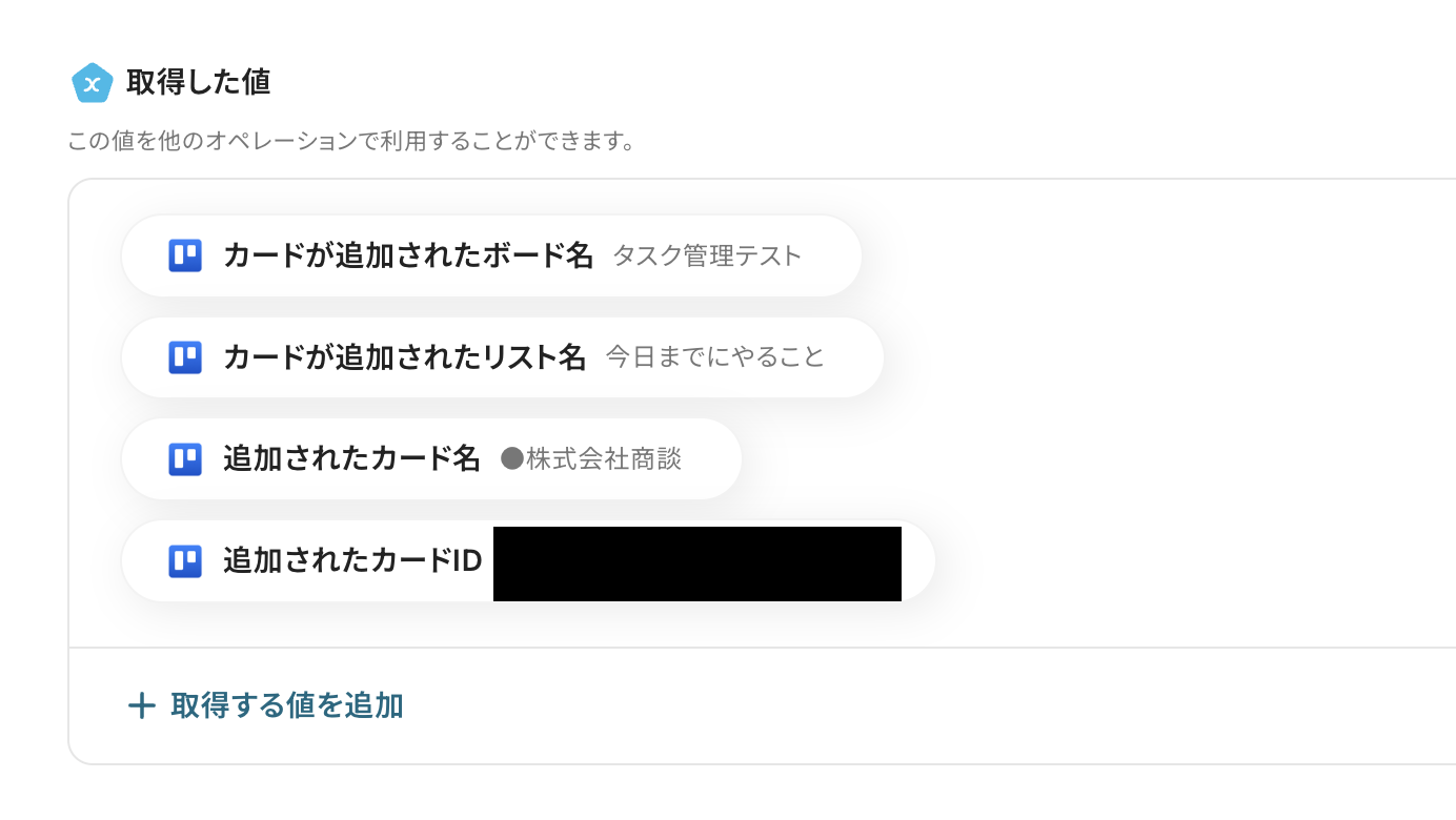 カードIDはTrelloのトリガーの取得した値から「追加されたカードID」を選択しましょう。