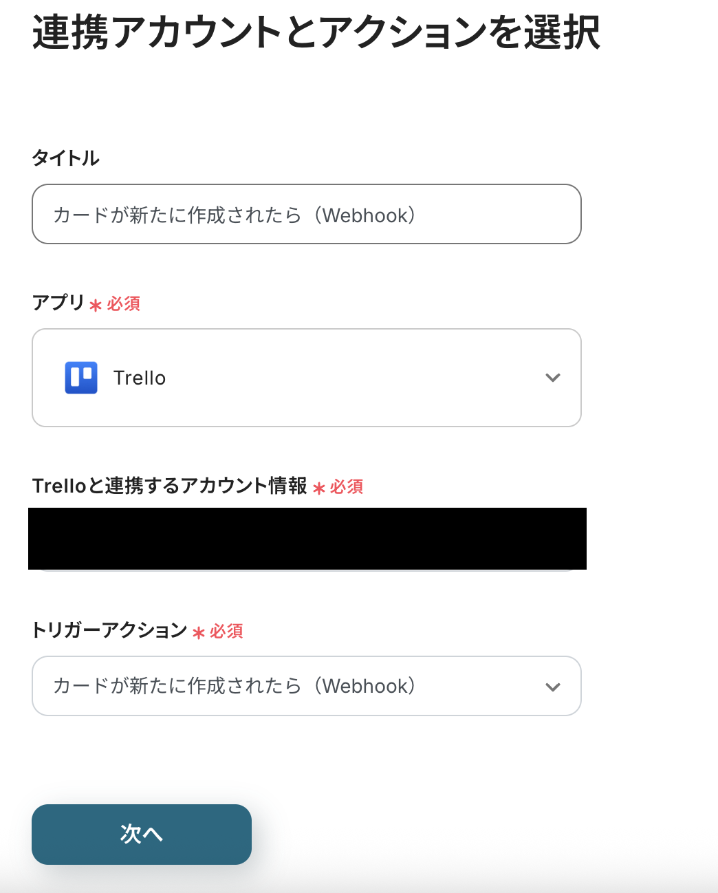- トリガーアクションは「カードが新たに作成されたら(Webhook)」が選択されています。