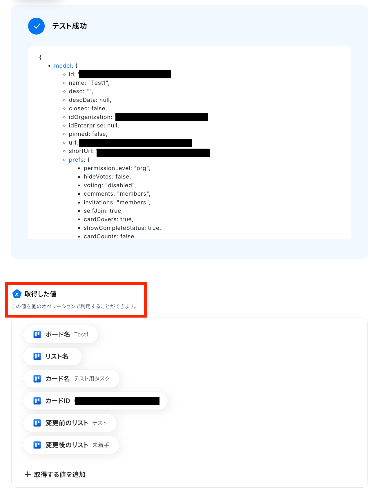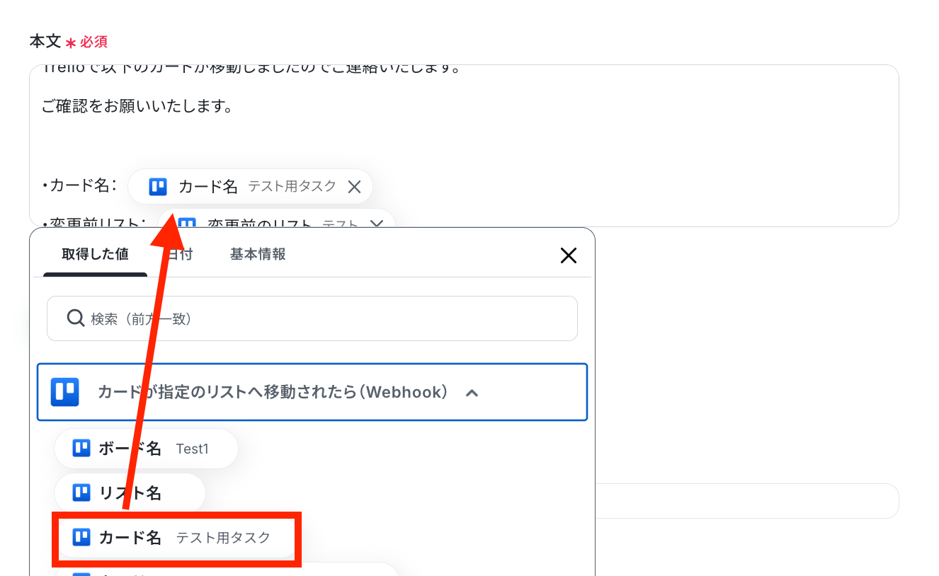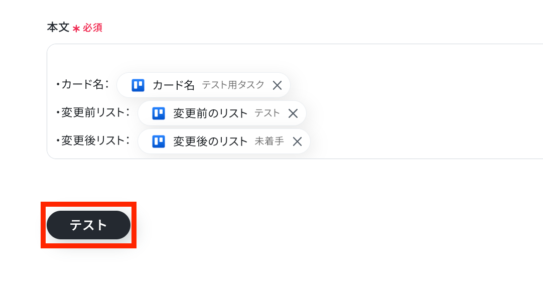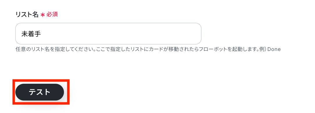 カードを移動させたい任意のリスト名を設定して、「テスト」ボタンをクリックしましょう!