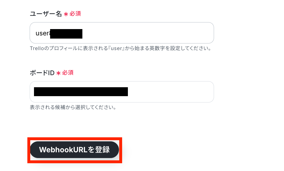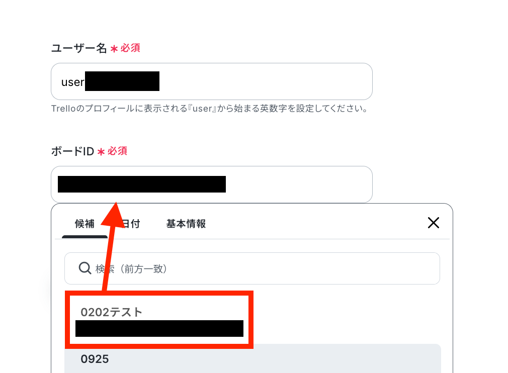 ユーザー名はTrello上で確認し、ボードIDを候補から選択します。