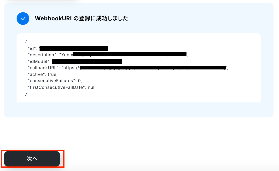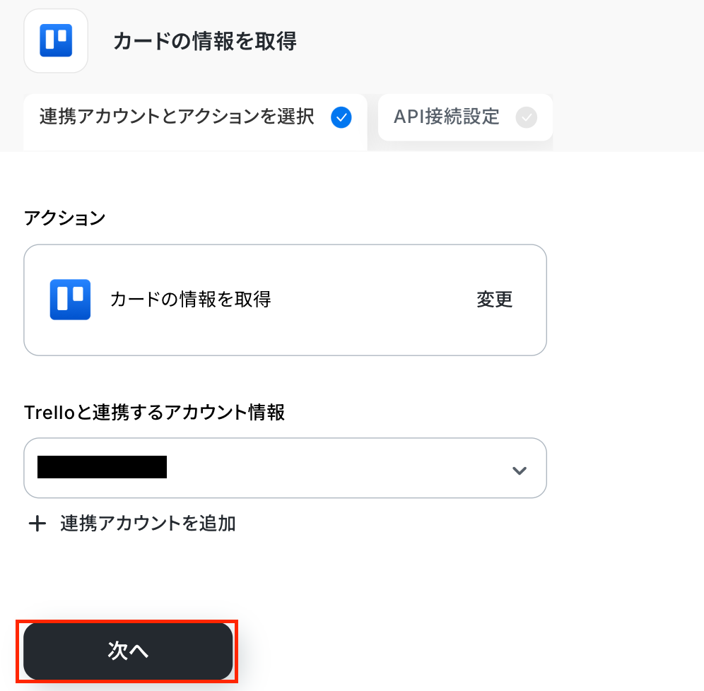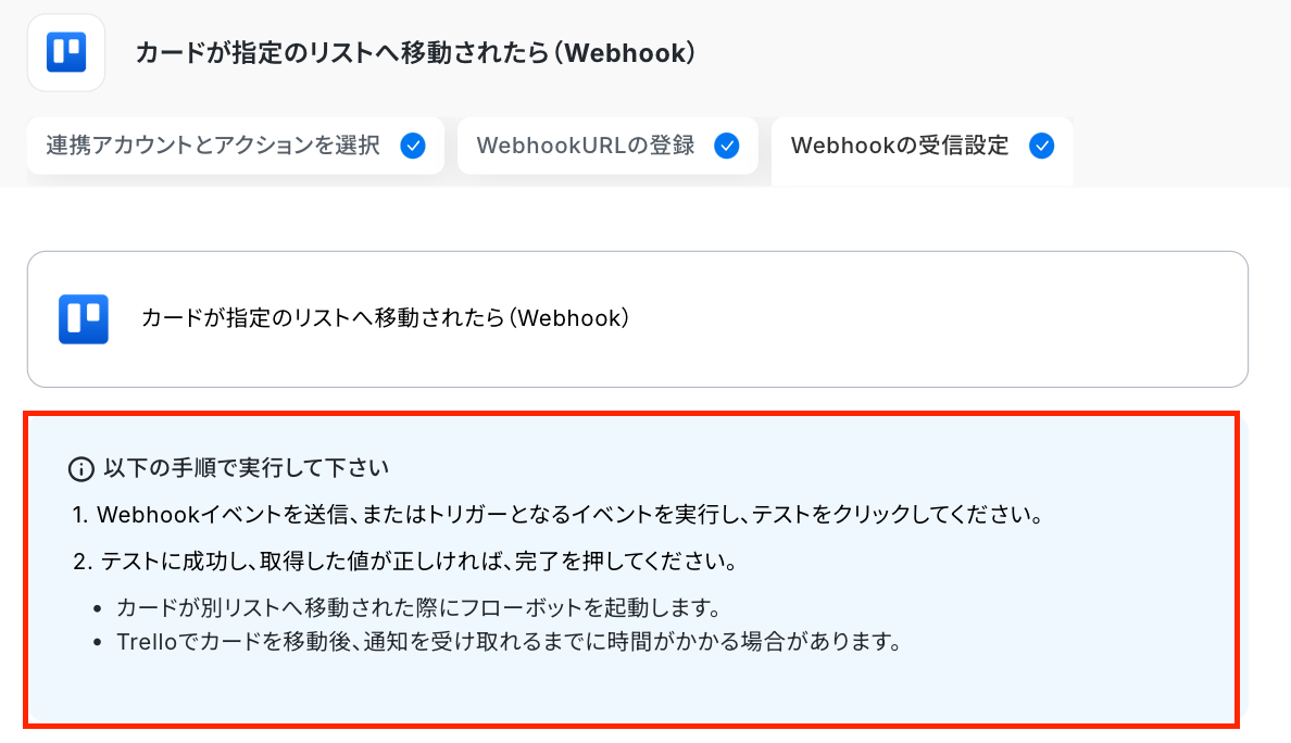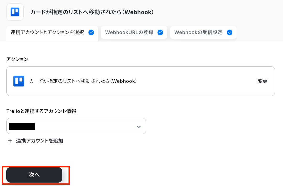 アクションは「カードが指定のリストへ移動されたら(Webhook)」に設定し、連携するアカウント情報を確認します。
