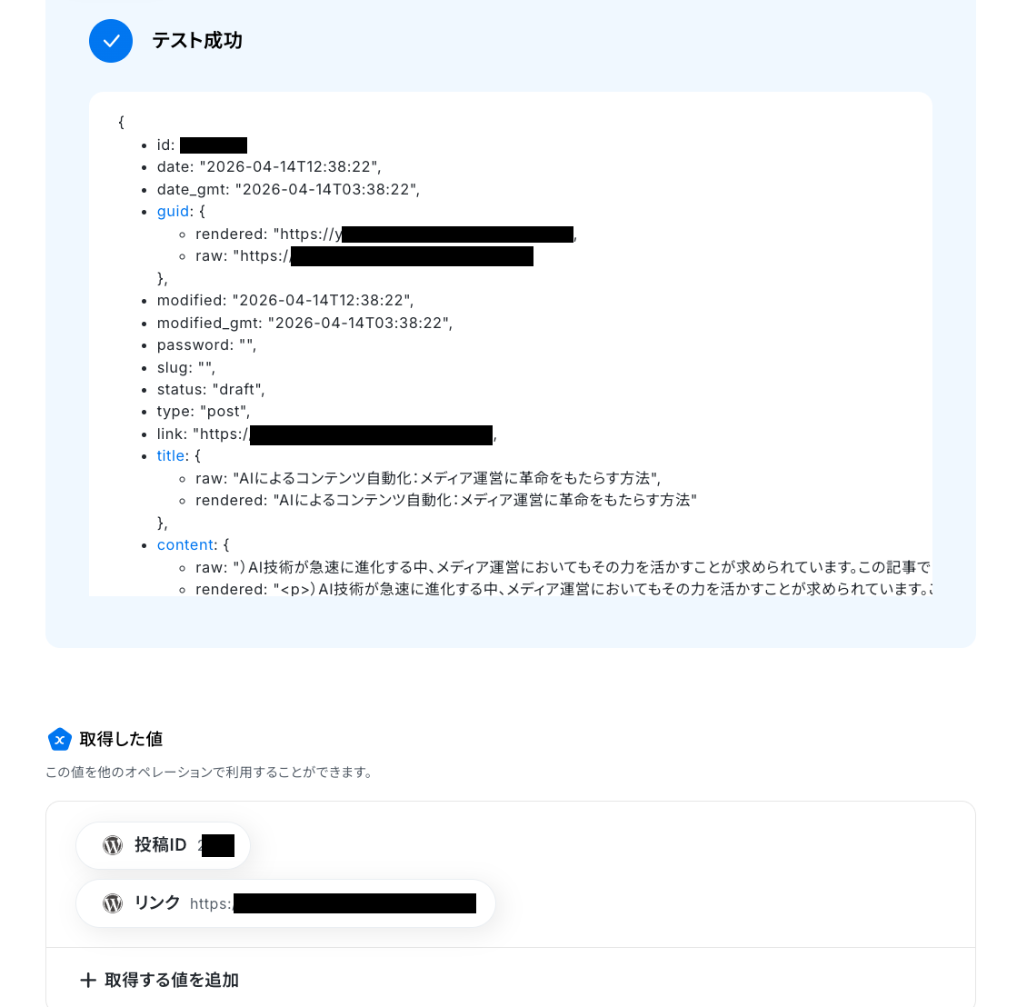 - 最後に、オペレーションで、WordPress.orgの「新規投稿を作成」アクションを設定し、抽出したテキストを元に下書き投稿を作成します