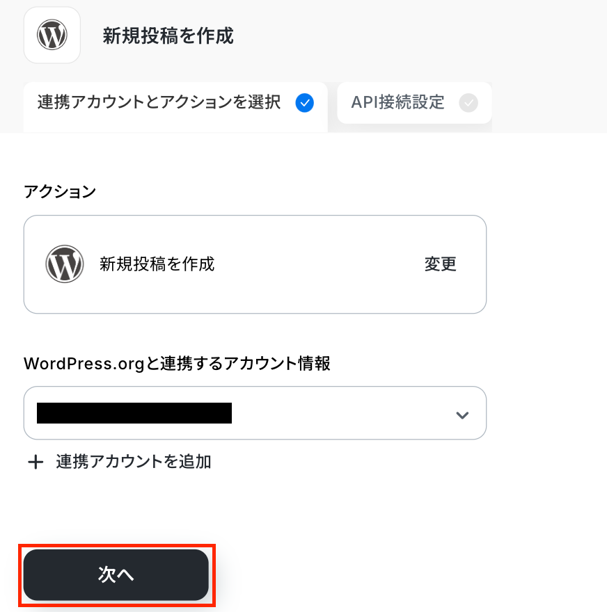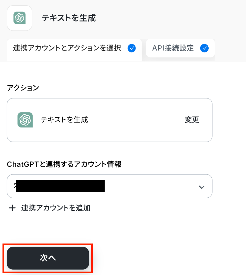 アクションはそのままで、連携するアカウント情報が合っているか確認をします。
