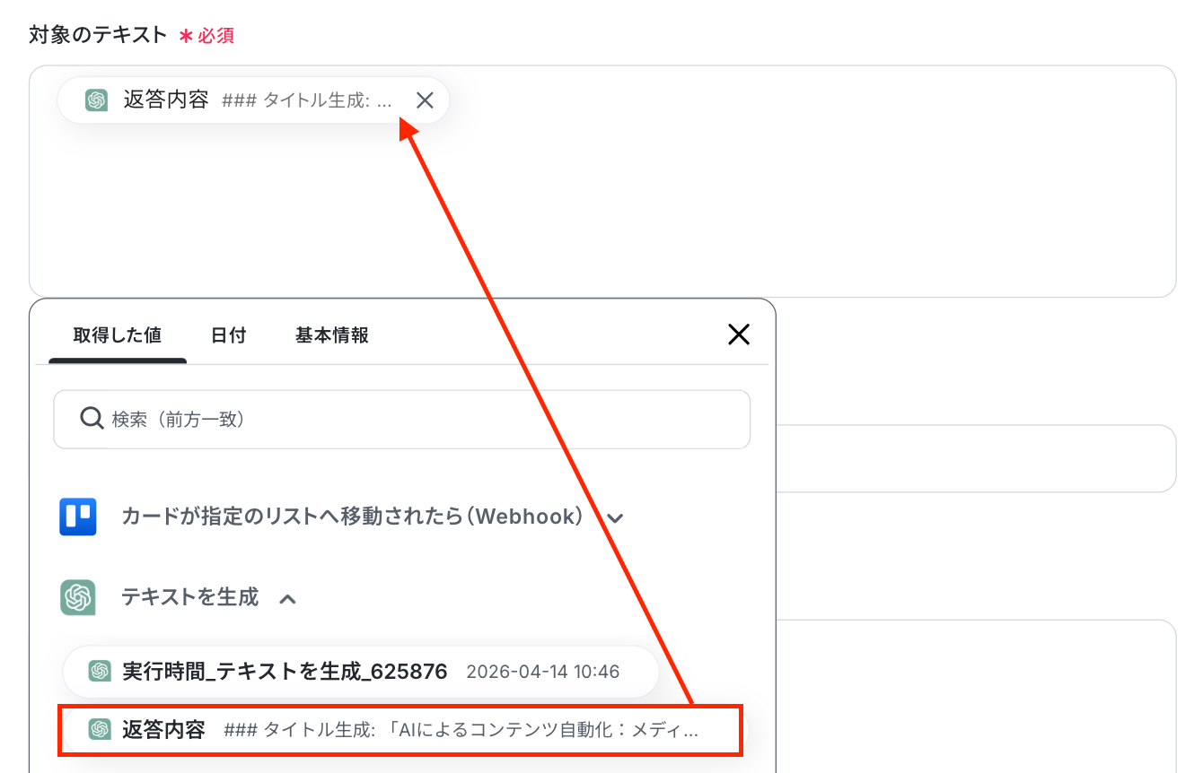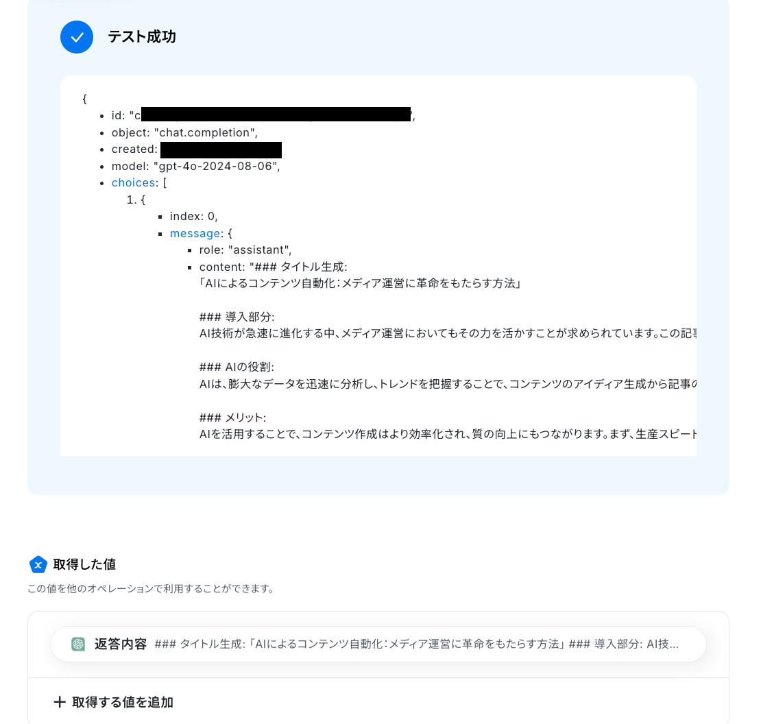 - 次に、オペレーションでChatGPTの「テキストを生成」アクションを設定し、取得したカード情報を元に投稿内容を生成します。
