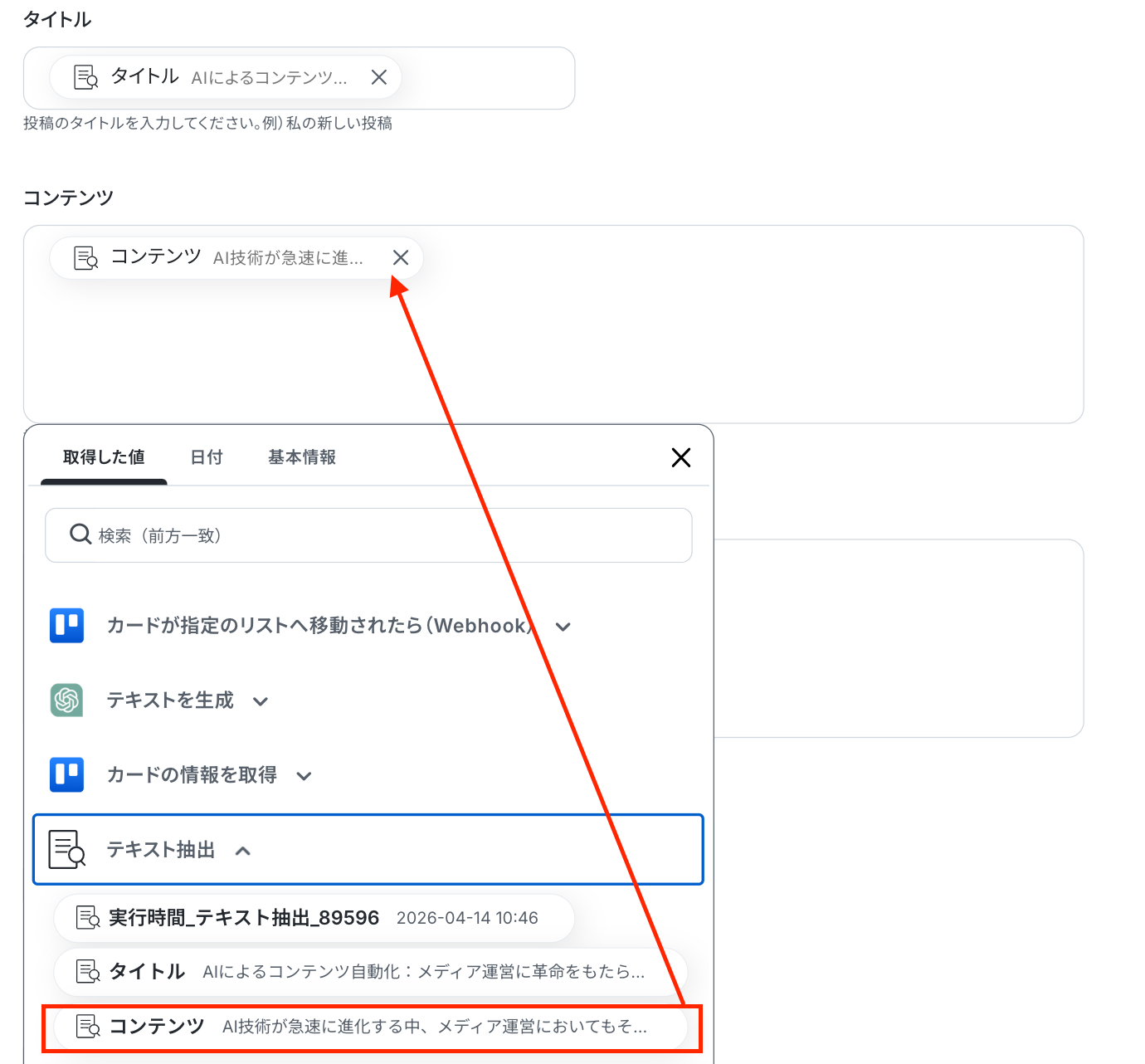 - WordPress.orgへの投稿アクションでは、タイトルや本文にTrelloやChatGPTから取得したどの情報を利用するかを任意でマッピング(紐付け)設定してください。投稿のステータス(下書き・公開など)も変更可能です。