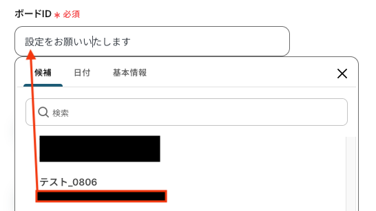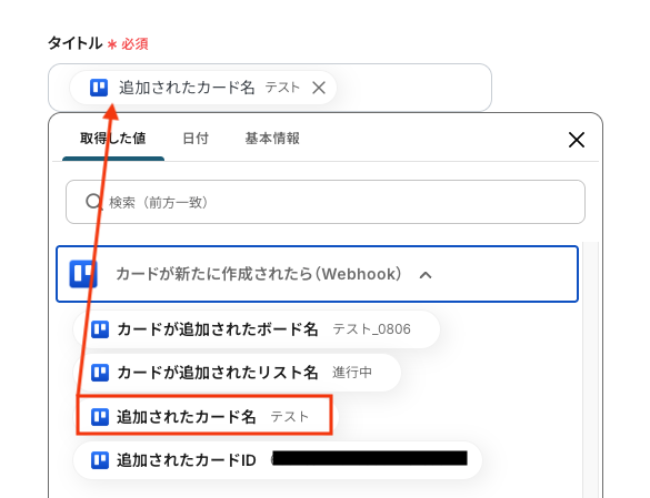 入力欄をクリックすると、前のステップでTrelloから取得済みのアウトプットが表示されるので、選択して入力しましょう。