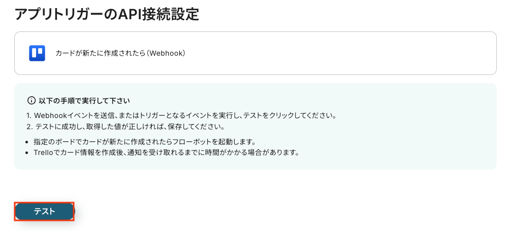 テスト用にTrelloで作成したカードの情報が正しく受信できるかどうか、「テスト」をクリックして確認しましょう。