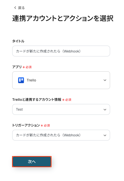 「カードが新たに作成されたら(Webhook)」をクリックします。