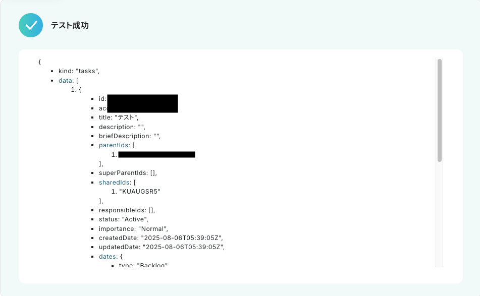 テストが成功すると、作成されたタスクの情報が一覧で表示されます。