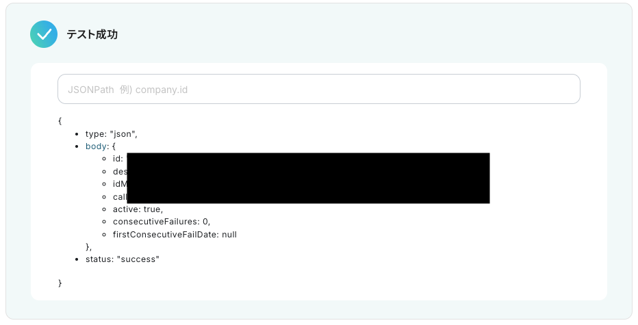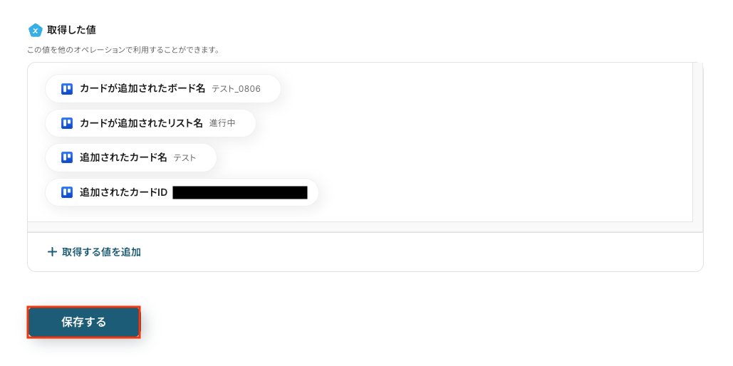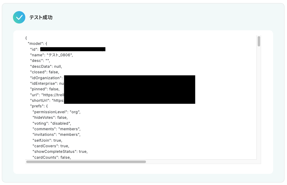 テストに成功すると、Trelloに作成されたカードに関する情報が表示されます。