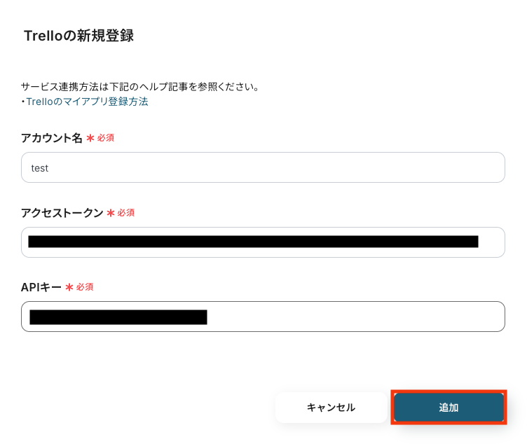 アカウント名、アクセストークン、APIキーをそれぞれ入力し「追加」をクリックしてください。