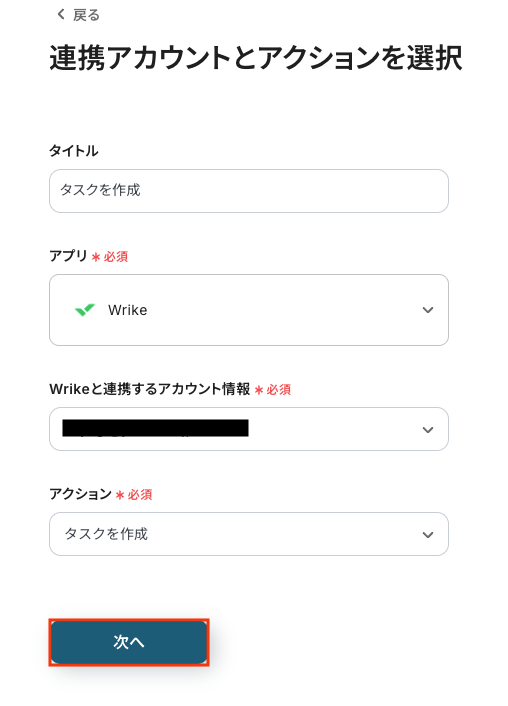 Wrikeと連携するアカウント情報に問題がなければ、「次へ」をクリックします。