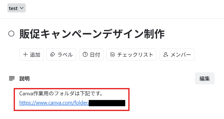 最後に、Trelloで作成したカードにCanvaで作成したフォルダのURLを追加し、カード情報を更新する設定を行います。