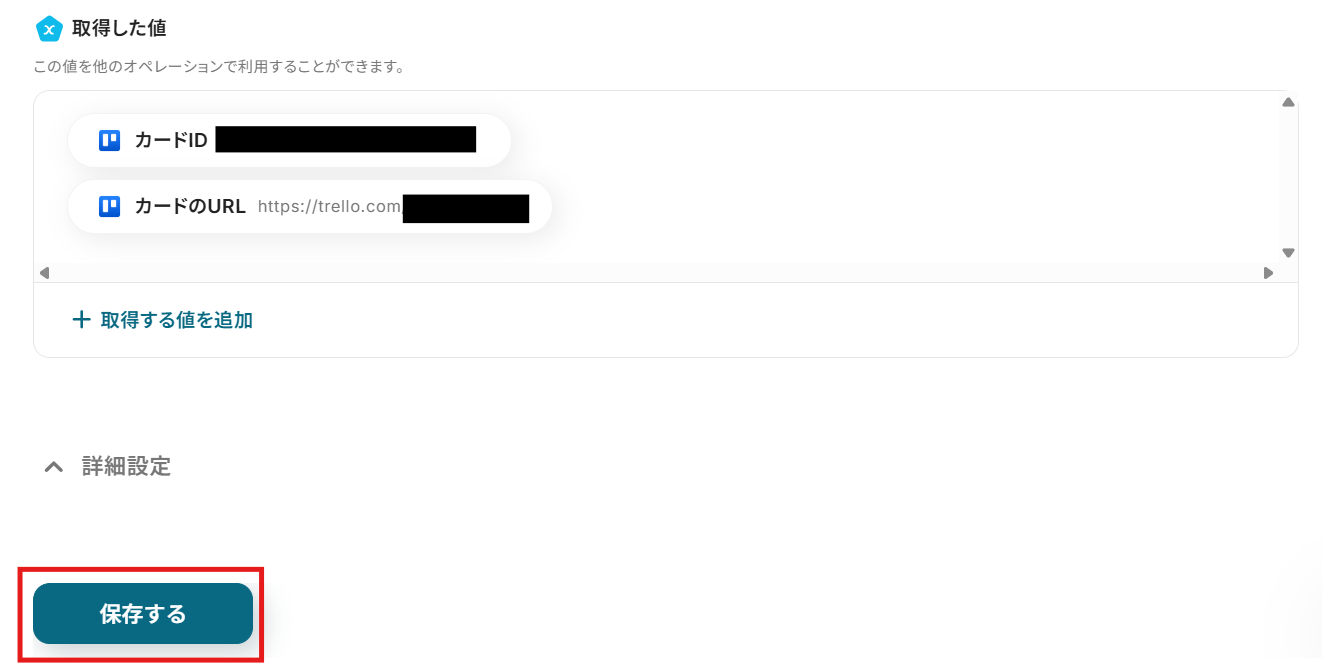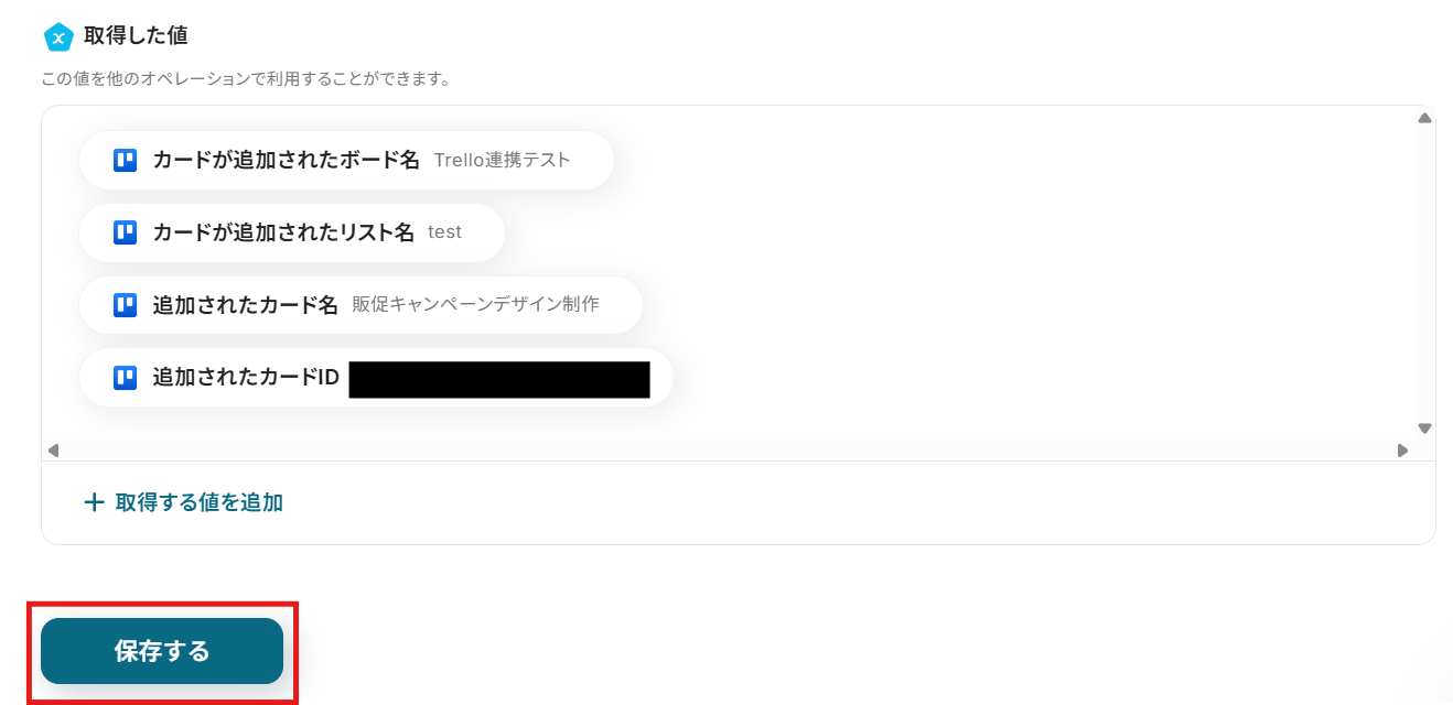 テストに成功すると、取得した値の各項目の横に、先ほどTrelloに作成したカードの詳細情報が表示されます。