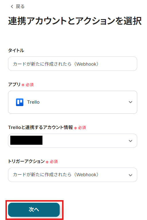 アカウント情報の項目には、ステップ1でマイアプリ連携したTrelloのアカウント情報が自動で表示されます。