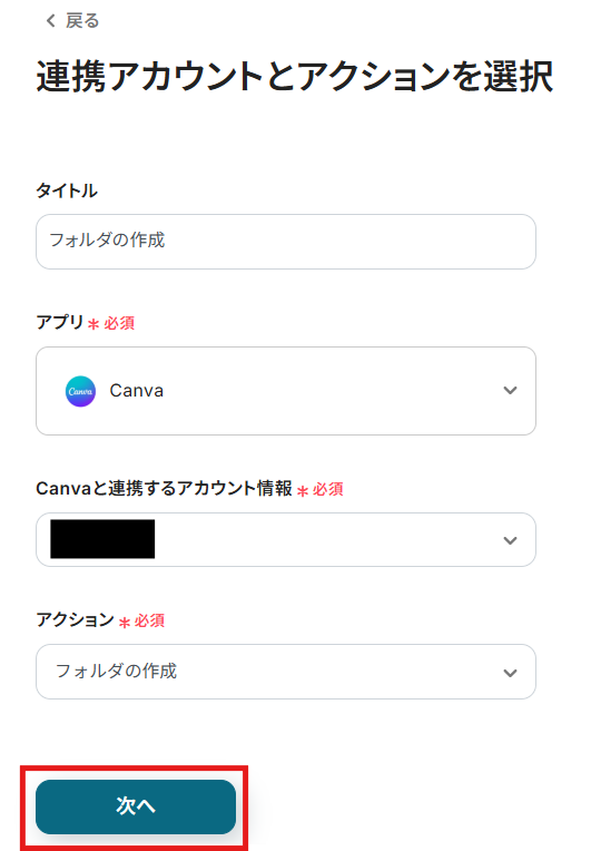 Trelloと同様に、ステップ1でマイアプリ連携したCanvaのアカウント情報が自動で表示されます。