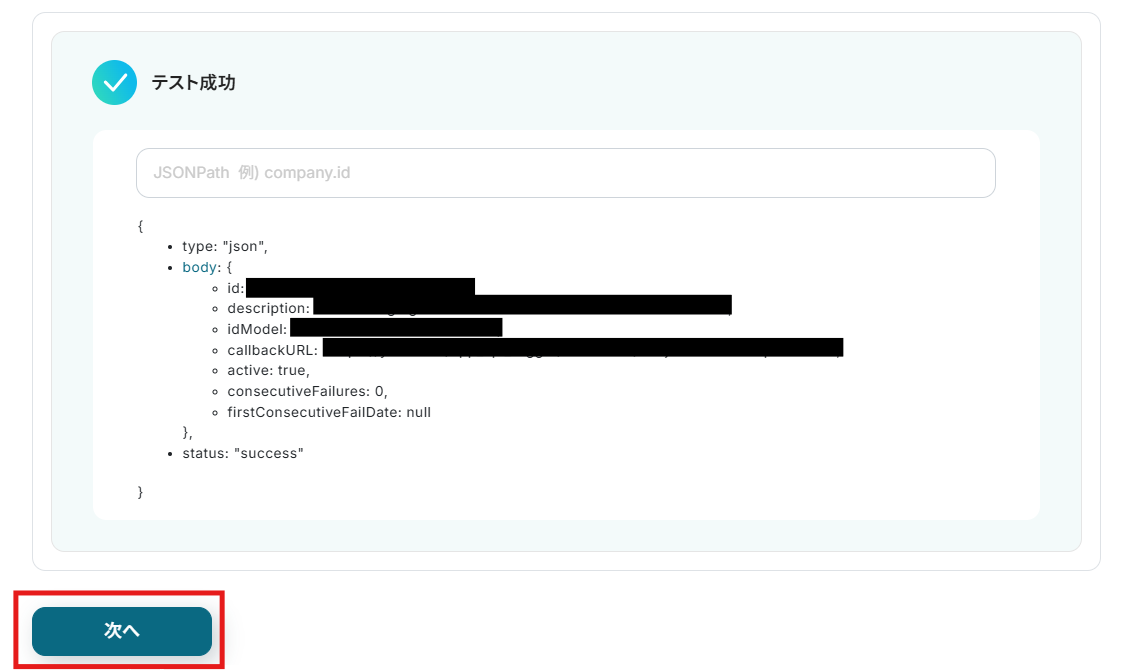 テストを実行し、成功したら「次へ」をクリックします。