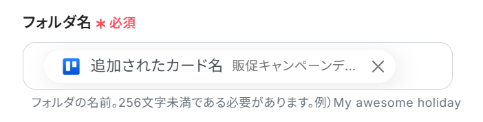 デフォルトでは、Trelloカードのタイトルがフォルダ名として使用されますが、カードが追加されたボード名やリスト名、作成日など、他の情報もフォルダ名に含めることができます。