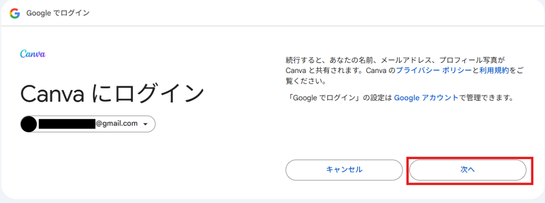 Canvaを選択すると下記の画面が表示されるので、連携したいアカウントでログインします。
