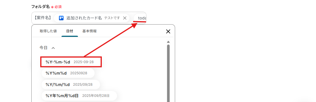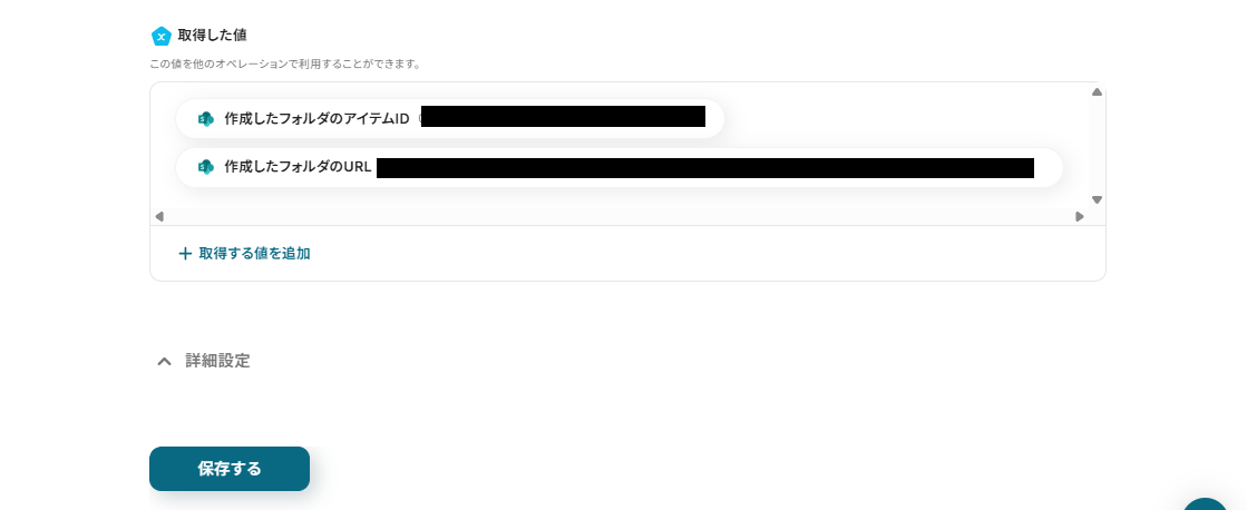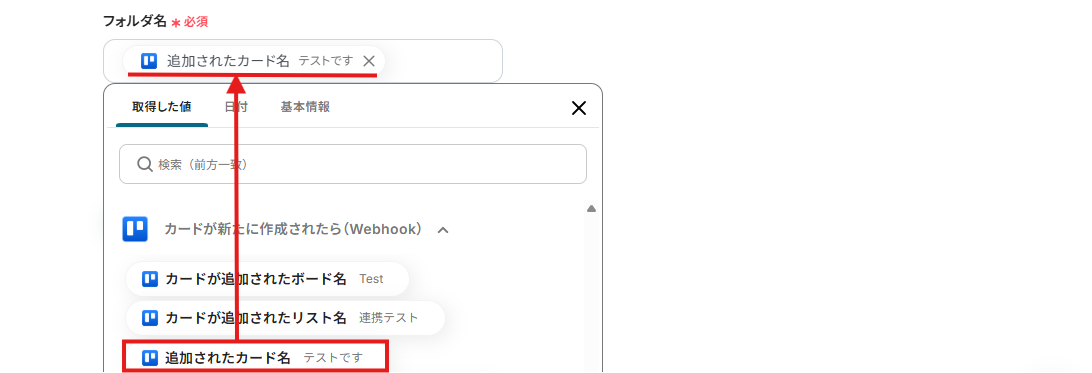 このように設定することで、Trelloに新規カードが作成されるたび「追加されたカード名」を引用し、自動でMicrosoft SharePointのフォルダ名に反映させることが可能です。