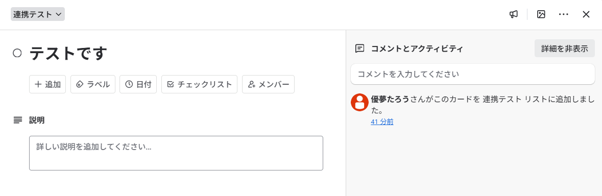 先ほど選択したTrelloのボードを開き、テスト用のカードを登録してください。