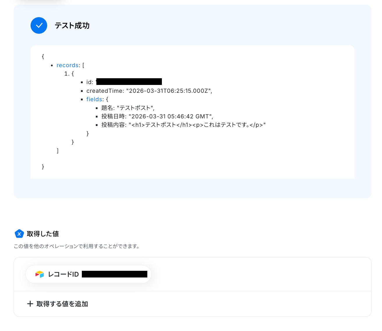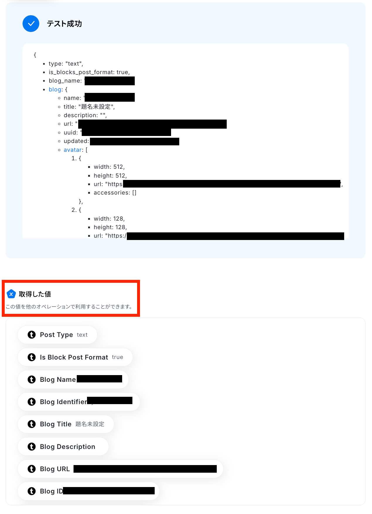 「テスト成功」と表示が出たら、取得した値が取得されます。