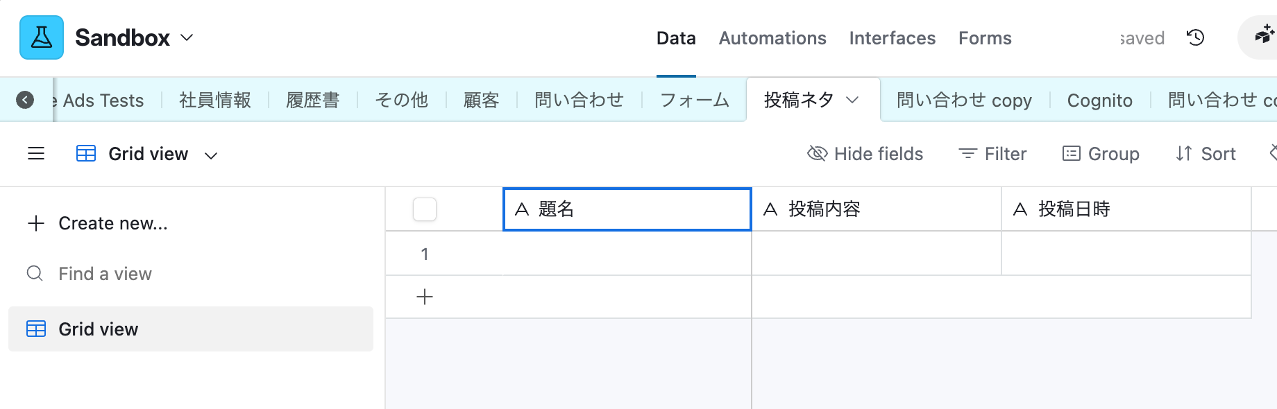Airtable上でレコードを追加する先のテーブルを作成しましょう!