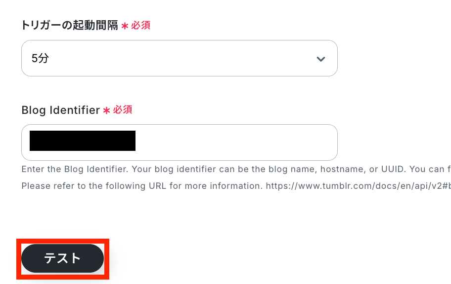 - Tumblrのトリガー設定では、通知対象としたいブログのIdentifier(識別子)を任意で設定してください