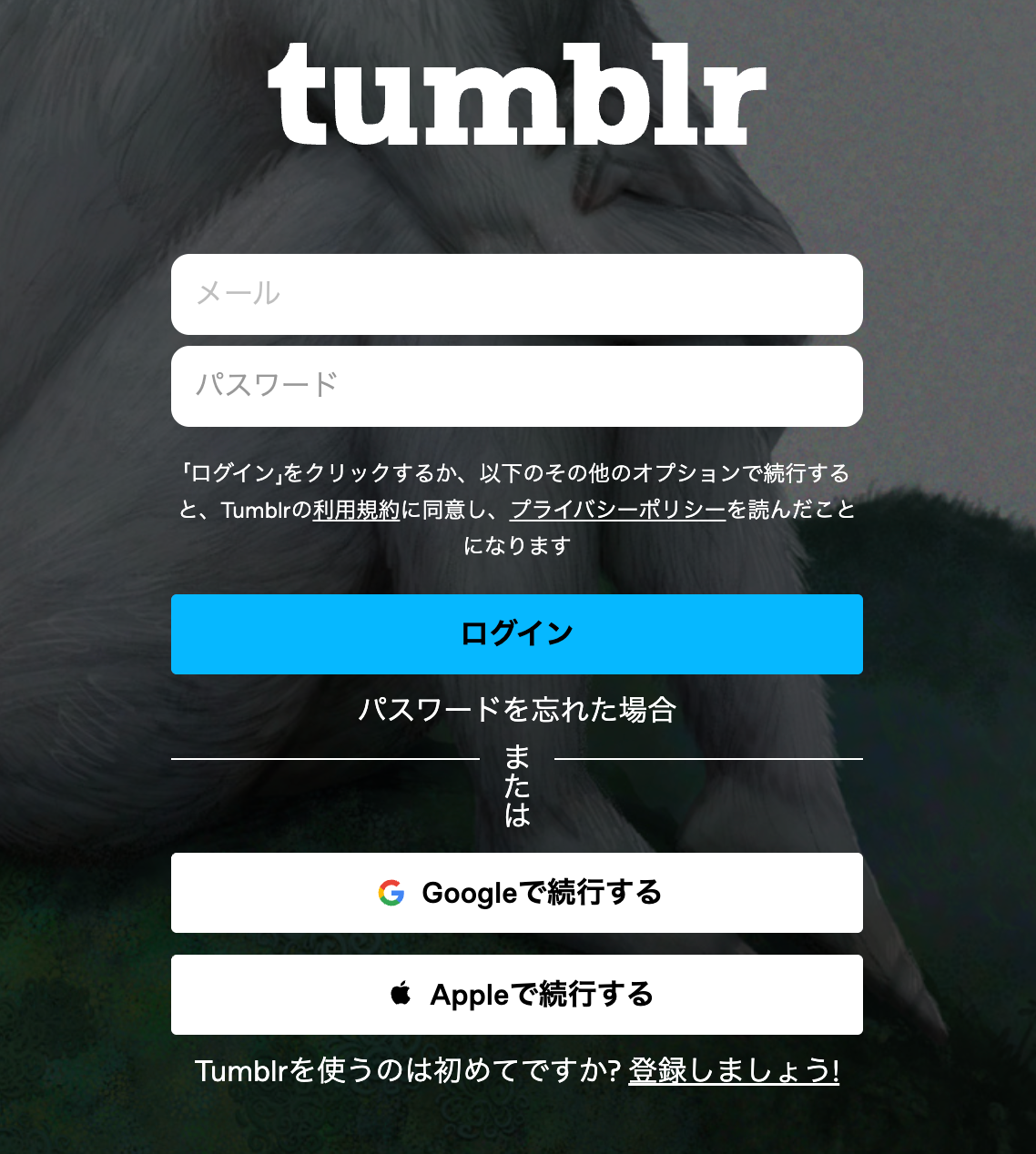 Tumblrに登録のあるメールアドレスとパスワードを記入して、「ログイン」ボタンをクリックします。