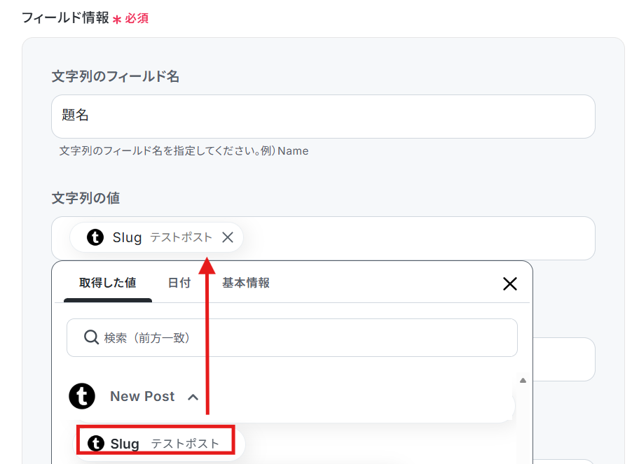 先ほど取得した値を活用して、フィールド情報を設定していきます。