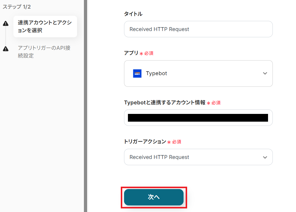 タイトルを任意で設定し、Typebotと連携するアカウントやトリガーアクションの内容を確認したら「次へ」を押してください。