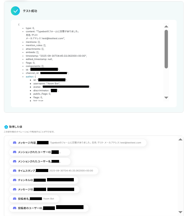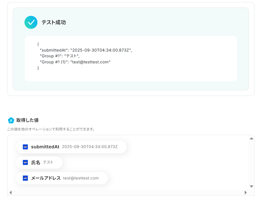「テスト成功」の文字とリクエスト内容がJSON PATHで表記され、「取得した値」にTypebotで受信したフォームの回答内容が反映されていれば成功です!
