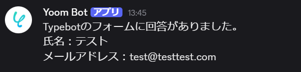 Typebotでフォームに回答が送信された瞬間に、その内容を自動でDiscordの指定チャンネルに通知する連携です。