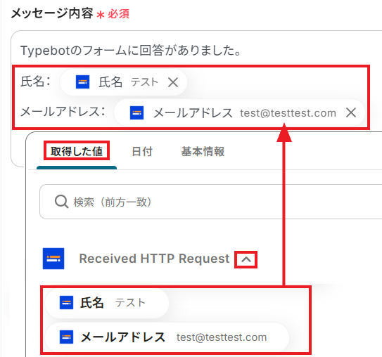 ・Typebotから受信した情報を取得する方法については、下記を参照してください。