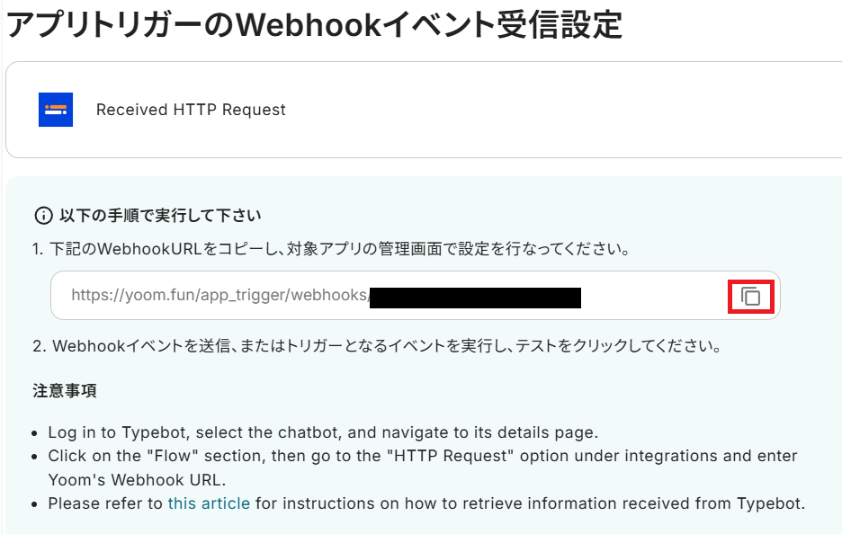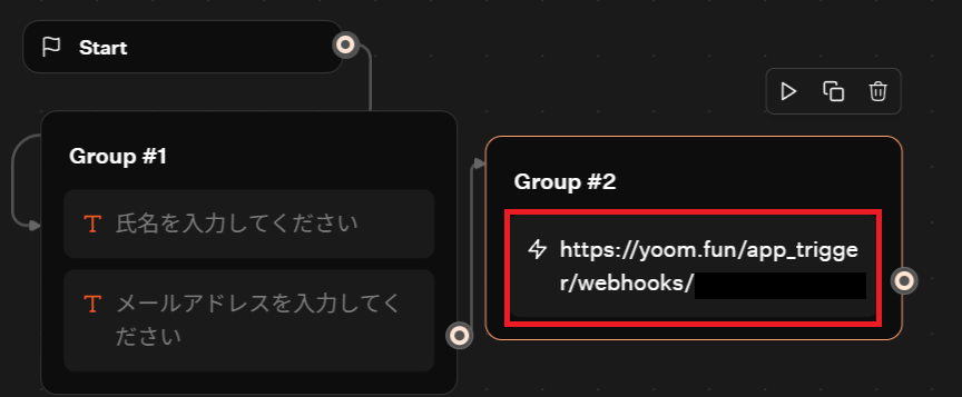 Yoomの設定画面で表示されるWebhookURLをコピーして、Typebotの該当フローにペーストしましょう。