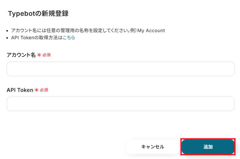 「API Token」はこちらのページを参考に、Typebotにログインした上で発行し、ペーストして「追加」ボタンを押してください。