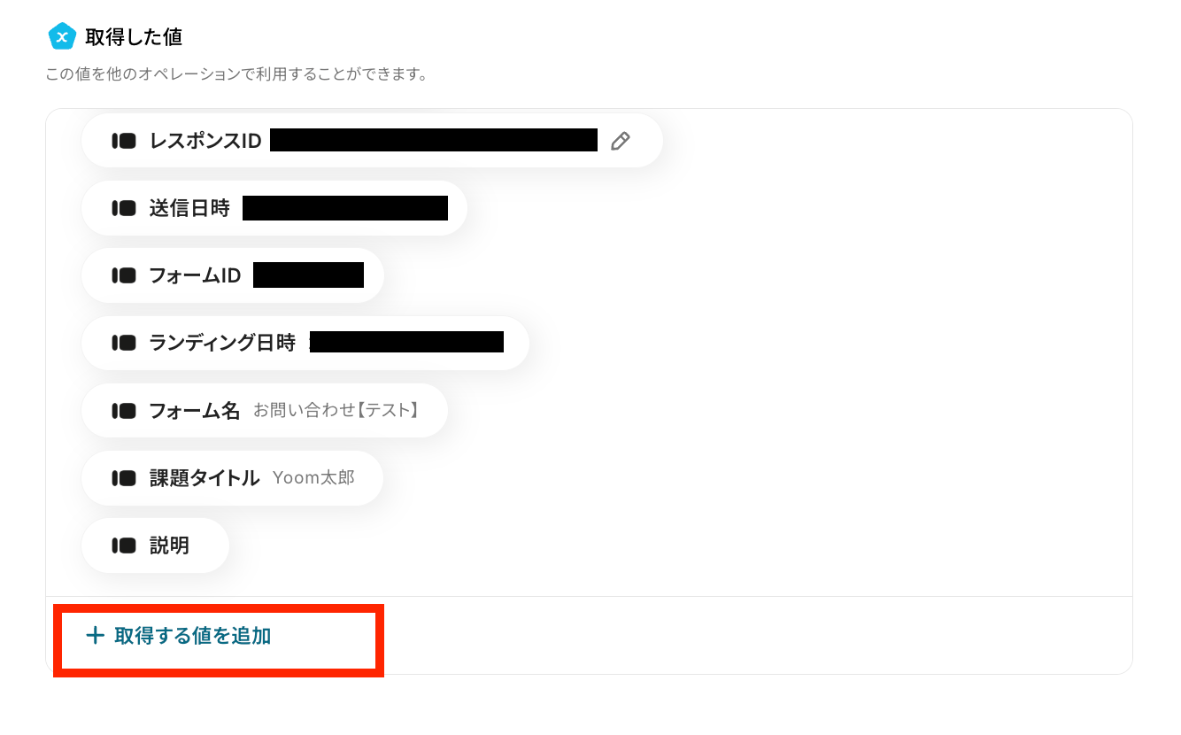 ※取得した値とは、トリガーやオペレーションにて受け取ったデータのことです。