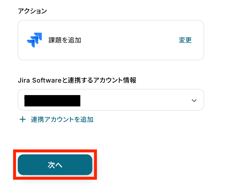 アクションは「課題を追加」のままで、連携するアカウント情報を確認します。