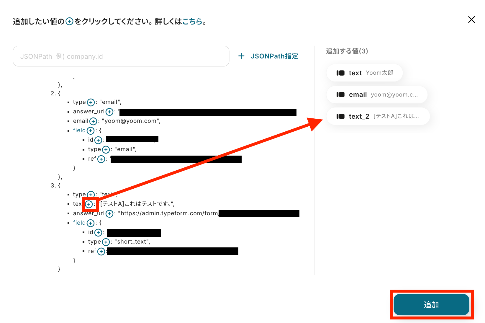追加したい項目の右にある「+」マークをクリックして追加する値を選択し、「追加」ボタンを押します。