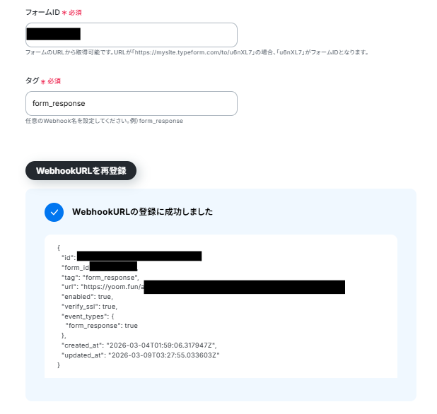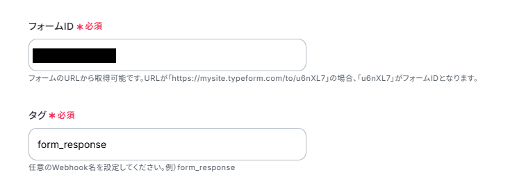 - Typeformのトリガー設定では、自動化の対象としたいフォームのIDやタグを任意で設定してください。これにより特定のフォームからの送信のみを検知できます。
