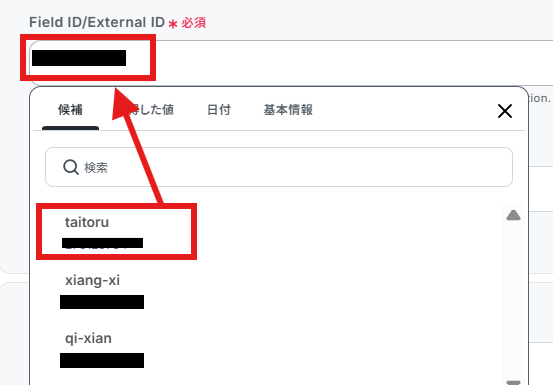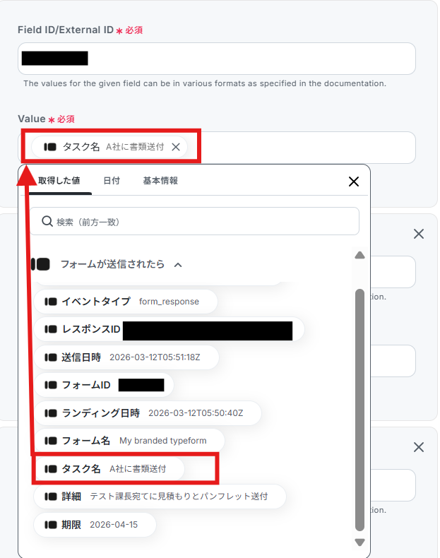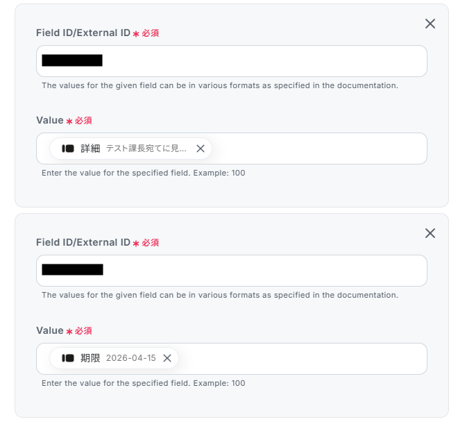 「Value」にField ID/External IDに対応する項目を、取得した値から設定してください。