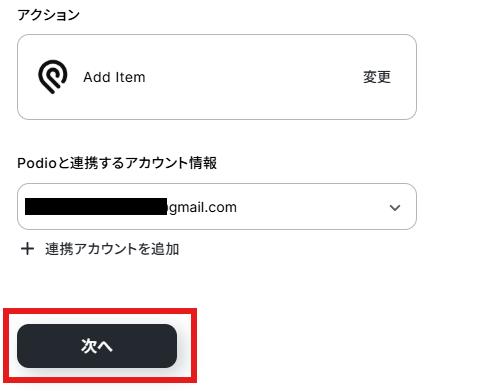 アクションはデフォルト設定のまま、アカウント情報は、連携したいアカウントが選択されているか確認してください。確認出来たら「次へ」をクリックしましょう。