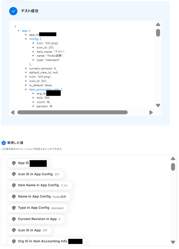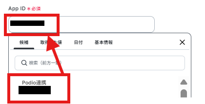 - Podioにアイテムを追加するオペレーションでは、対象のApp IDやデータを登録したいField IDなどを任意で設定してください。