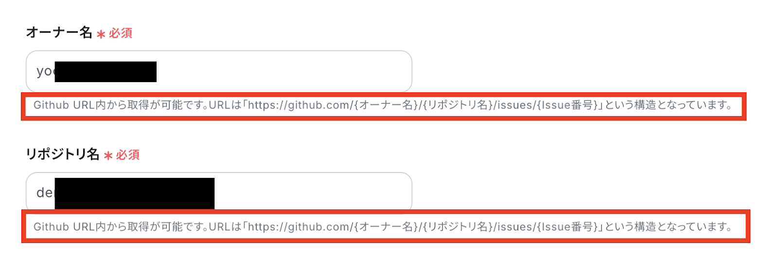 APIの接続設定をする Issueの作成場所を指定していきます。 作成したい場所の「オーナー名」と「リポジトリ名」について、赤枠部分の文言を確認しながら入力してください。