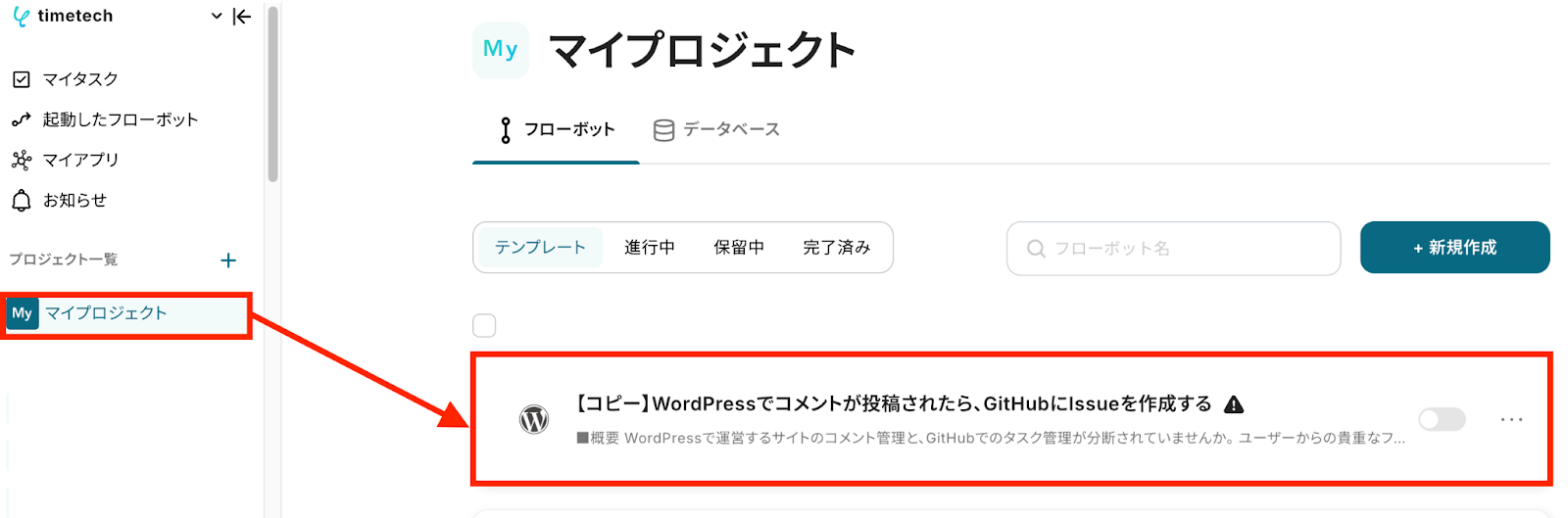 テンプレートが「マイプロジェクト」にコピーされると、このような画面が表示されます。